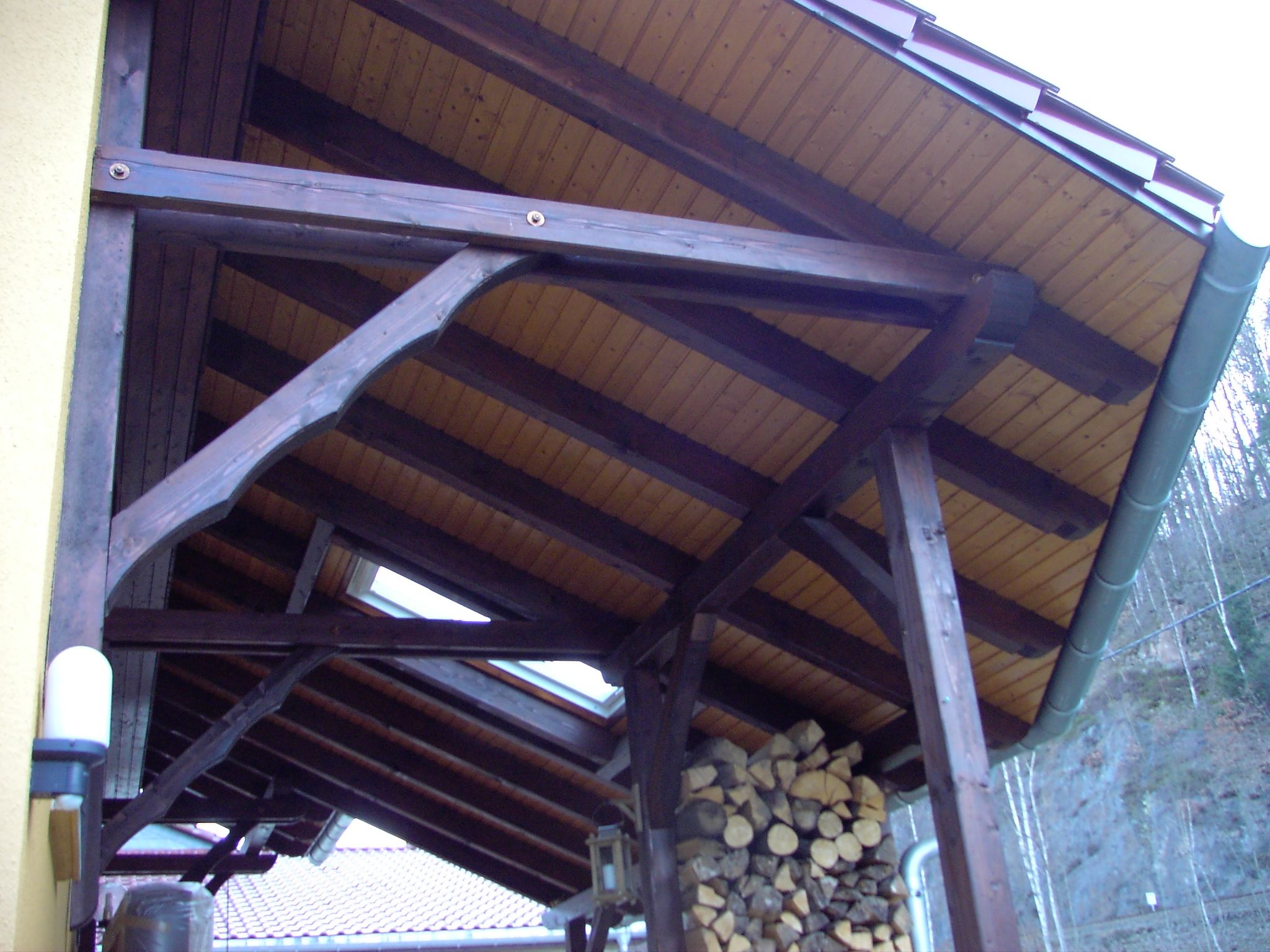 Die Sparren lagern auf voneinander unabhängigen Längsträgern (Pfetten). Sie werden durch Streben und Pfosten unterstützt. Die Dachlast liegt so zum Teil auf den Außenwänden, sowohl auch auf den durch die Pfetten gestützten Innenwänden..